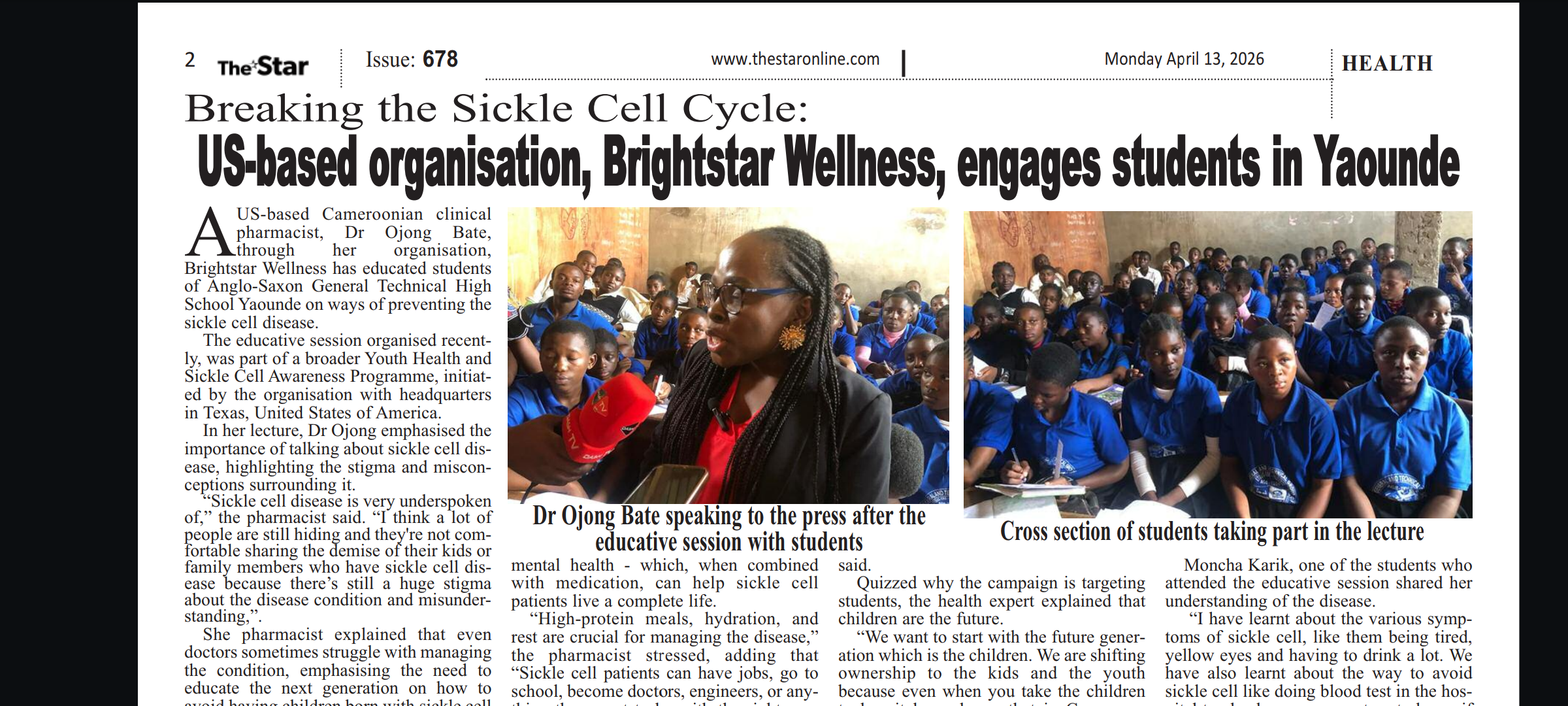 The Star News: Brightstar Wellness Leads Sickle Cell Awareness Campaign Among Students in Yaoundé
